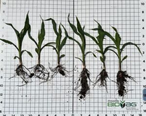 The results are clear. The control plants (left) is noticeably shorter, with thinner stalks and a less developed root system. In contrast, the TerraNu treated plant (right) exhibits significantly more vigorous root growth, great root density, and enhanced root depth. The stalk is visibly thicker and nearly an inch taller – indicators of improved plant health and resilience.