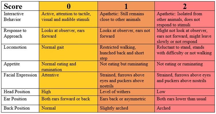 It is fundamentally important to address pain for the animal’s benefit and production efficiency. Noticing early physiological and behavioral changes can help producers recognize problems before the pain becomes chronic or debilitating. For example, when calves are dehorned and in pain, they will flick their ears and shake their heads repeatedly. Noticing these behavioral changes, along with redness and warmth of horn buds, gives producers the opportunity to manage calf pain and decrease the risk of future health challenges, like scours. Another example is catching early signs of digital dermatitis before it becomes clinical digital dermatitis. A cow with early digital dermatitis will change her gait slightly as an indicator of pain. A producer can recognize that the animal is in pain and trim treat the infection before it becomes clinical digital dermatitis. It can be difficult to know when cows are experiencing pain as cows cannot express how they feel. It is important to use available tools like the cattle pain scale to help detect changes associated with pain. Listed below are six factors to consider when scoring pain. Sick animals should be isolated, placed in clean, well-bedded areas with individual food and water supplied. They should be observed frequently using the pain scale. Prompt recognition and treatment of diseases are essential to reduce pain in farm animals.