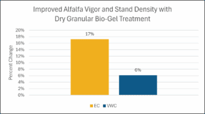 As shown above, the alfalfa stand treated with dry fertilizer coated in Bio-Gel dry granular (right), has more vigor and density when compared to the control which did not receive the Bio-Gel treatment. Bio-Gel helps retain soil moisture after each precipitation event which is important in rain fed agricultural systems. In this system, volumetric soil moisture content increased 6% in the treatment zone compared to the control. Increasing soil moisture content also enhances the crops resistance to heat stress as well as maintaining fertilizer availability throughout the growing season. Treating dry fertilizer with Bio-Gel technology allows for stands that yield more tons per acre than those left untreated maximizing the ROI of the dry fertilizer and gaining production on ever acre.