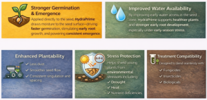 - Improves seed hydration and uniform emergence