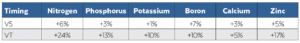 - Tissue samples analyzed at V5 and VT showed higher levels of key nutrients in TerraNu when compared to the control. See individual nutrient results below.