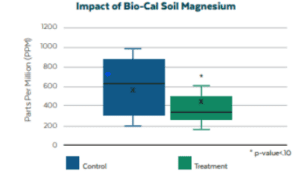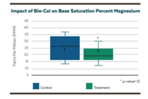 In South Central Wisconsin, Bio-Cal significantly lowered soil magnesium levels in a soil influenced by dolomitic parent material. After two years of applying Bio-Cal at 500 pounds per acre, soil magnesium dropped by 32% (equating to a reduction of 386 pounds per acre). Along with this reduction, base saturation magnesium decreased by 5.66% (from 26% to 20%), without affecting other base saturation levels.