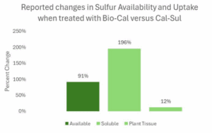 Bio-Cal, when compared to traditional calcium / sulfur inputs, reported increased sulfur availability despite lower applied rates of sulfur with Bio-Cal.